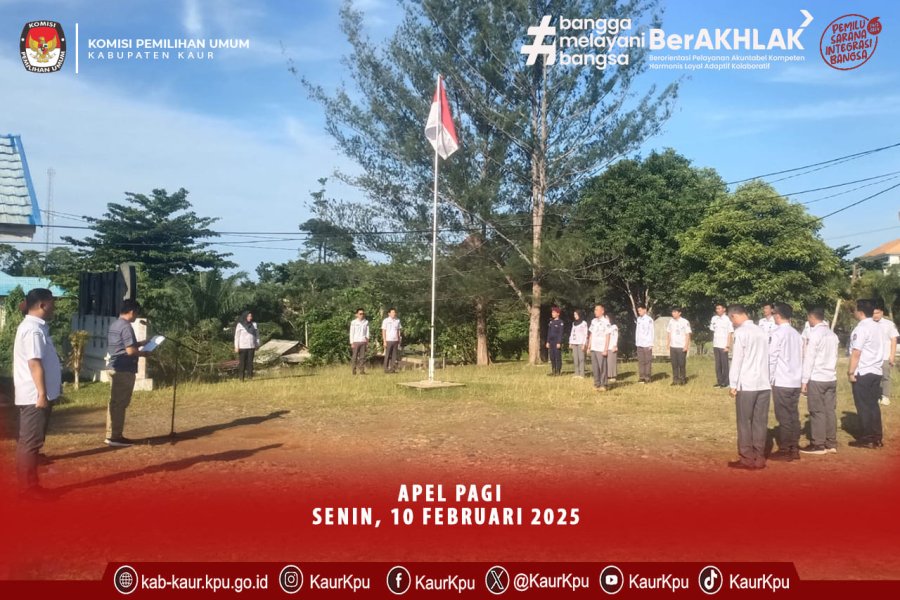 #TemanPemilih, Jajaran Sekretariat KPU Kabupaten Kaur melaksanakan Apel Pagi bersama di halaman Kantor KPU Kabupaten Kaur, Senin (10/02/2025) Pagi. Apel pagi dipimpin oleh Ketua KPU Kabupaten Kaur Muklis Aryanto beserta Sekretaris Rusdan Tafsiri, Para Kasubbag, seluruh Staf ASN dan PPNPN KPU Kabupaten Kaur. Apel rutin dilakukan setiap Hari Senin dan diisi dengan pembacaan teks Pancasila, Teks Pembukaan UUD 1945 dan Amanat dari Pembina Apel. #KPUMelayani ....