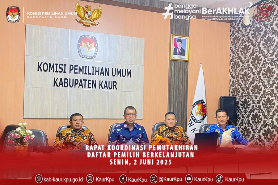 KPU Kabupaten Kaur telah Melaksanakan Rapat Pleno Terbuka Rekapitulasin Pemutakhiran Data Pemilih Berkelanjutan (PDPB) Tingkat Kabupaten Kaur Pada Triwulan Tiga bertempat di Media Center KPU Kabupaten Kaur, Kamis (2/10/2025) Rapat Pleno ini dipimpin oleh Plt Ketua KPU Kabupaten Kaur Jailani dan di dampingi oleh seluruh Anggota KPU Kabupaten Kaur beserta jajaran. Rapat Pleno ini juga dipandu oleh Anggota KPU Kabupaten Kaur Divisi Perencanaan Data dan Informasi Didi Iswandi yang menjabarkan Hasil dari Penyusunan PDPB pada Triwulan Tiga. Kegiatan ini merupakan bagian dari komitmen KPU dalam memperbarui data pemilih secara berkala dan memudahkan proses penyusunan daftar pemilih pada Pemilu atau Pemilihan berikutnya secara akurat. Rapat pleno ini juga dihadiri oleh , Bawaslu Kaur, Kesbangpol Kaur, Kodim 0408 BS/Kaur, Polres Kaur, Kejaksaan Negri Kaur, BPS Kabupaten Kaur, Partai Politik Peserta Pemilu 2024. Berdasarkan Keputusan KPU Kabupaten Kaur Nomor 10 Tahun 2025 menetapkan bahwa Rekapitulasi Pemutakhiran Data Pemilih Berkelanjutan (PDPB) Triwulan Tiga Tahun 2025 “Jumlah pemilih hasil pemutakhiran terdiri dari 50.509 (lima puluh ribu lima ratus sembilan) pemilih laki-laki dan 48.303 (empat puluh delapan ribu tiga ratus tiga) pemilih perempuan, sehingga total keseluruhan adalah 98.812 (sembilan puluh delapan ribu delapan ratus dua belas) pemilih.” dapat di download pada link Keputusan KPU Kabupaten Kaur Nomor 10 Tahun 2025 #KPUMelayani ....