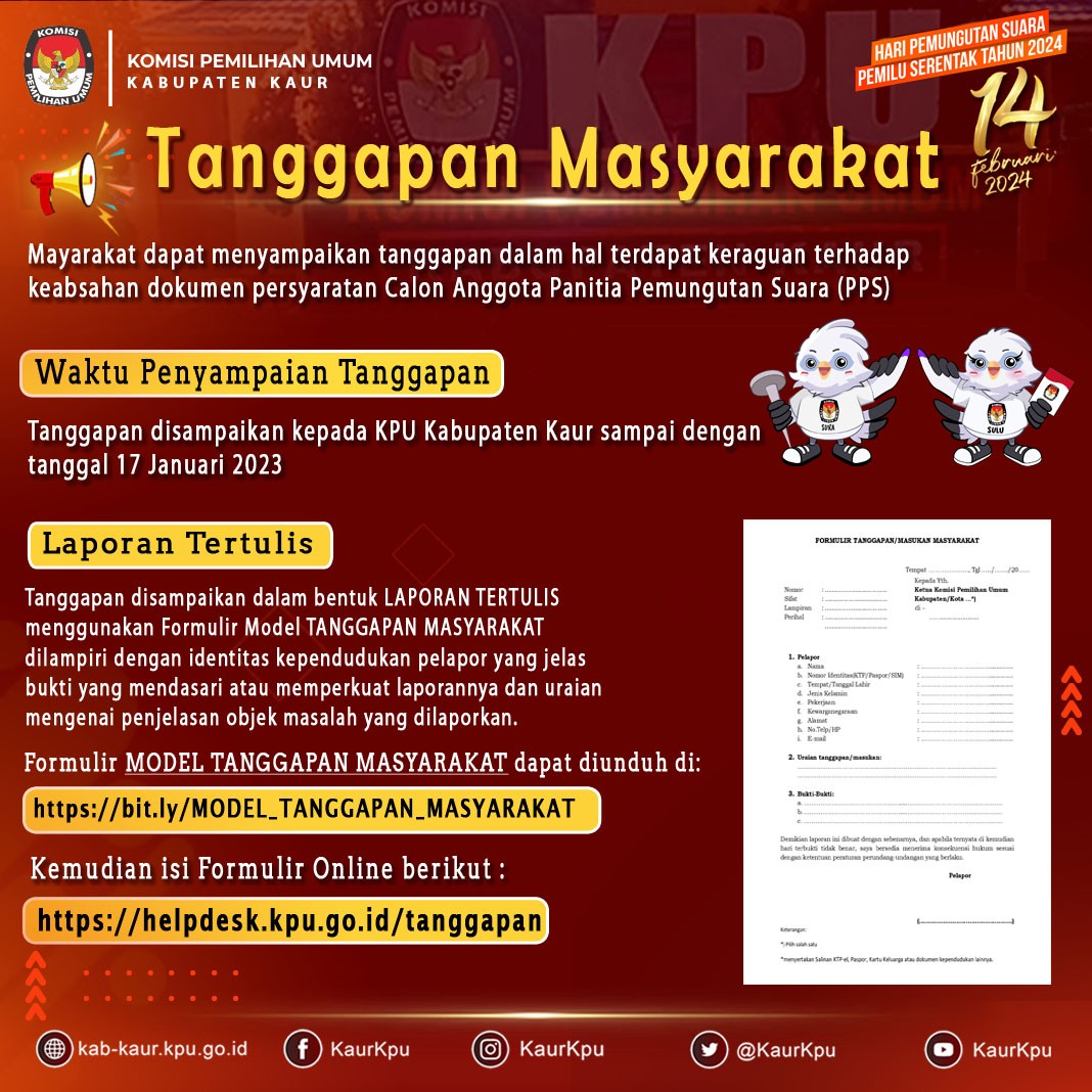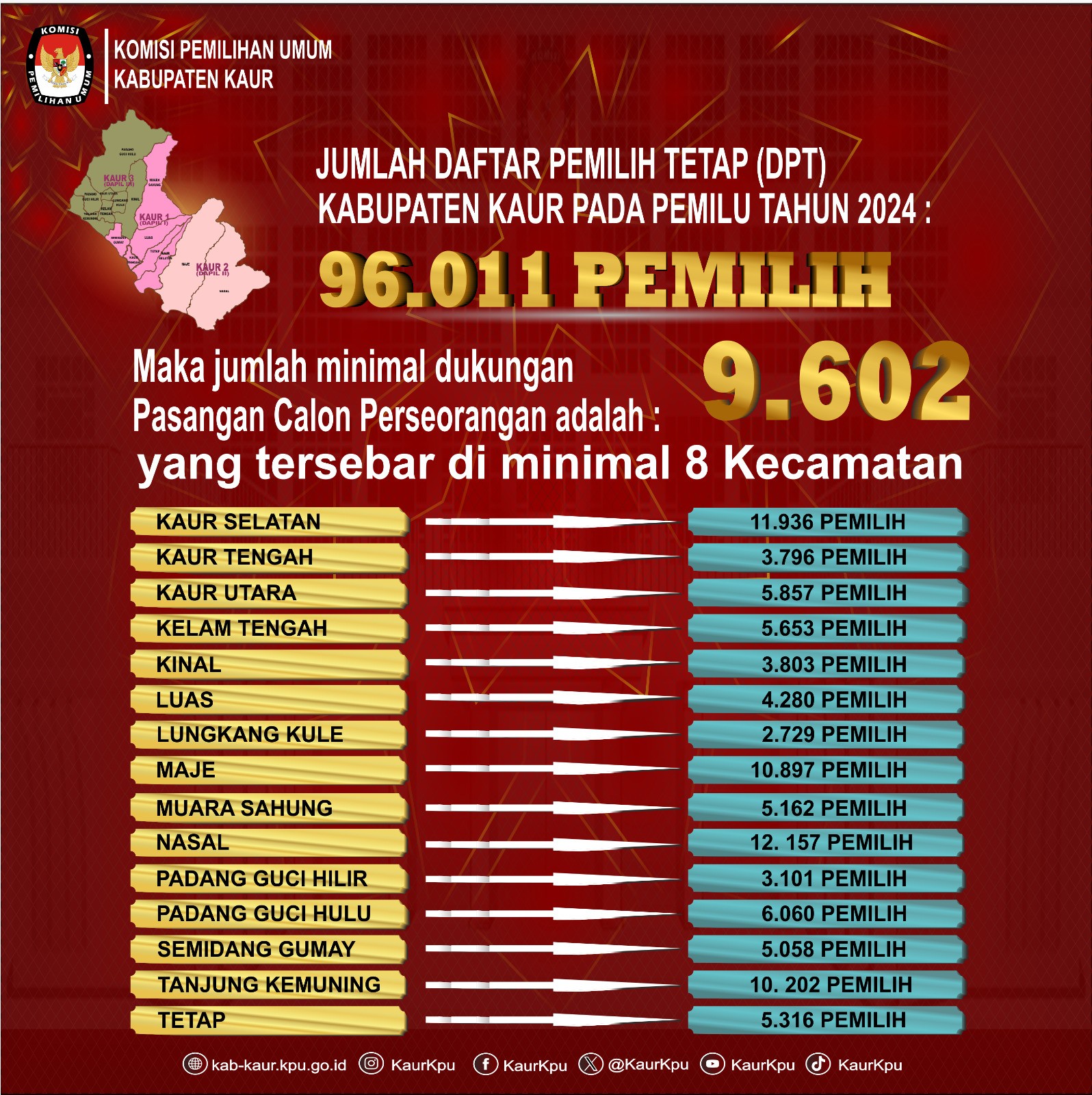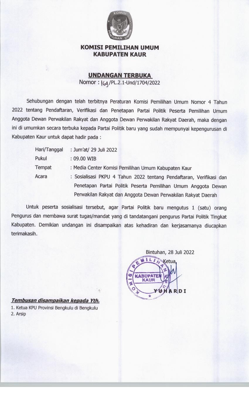 #TemanPemilih, Sehubungan dengan telah terbitnya Peraturan Komisi Pemilihan Umum Nomor 4 Tahun 2022 tentang Pendaftaran, Verifikasi dan Penetapan Partai Politik Peserta Pemilihan Umum Anggota Dewan Perwakilan Rakyat dan Anggota Dewan Perwakilan Rakyat Daerah, maka dengan ini di umumkan secara terbuka kepada Partai Politik baru yang sudah mempunyai kepengurusan di Kabupaten Kaur untuk dapat hadir pada :