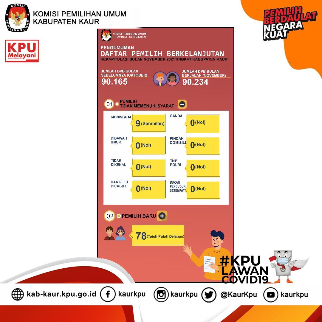 Pemutakhiran Daftar Pemilih Berkelanjutan (PDPB) Komisi Pemilihan Umum Kabupaten Kaur untuk Bulan November 2021 Berjumlah 90.234 orang yang tersebar di 15 (lima belas) Kecamatan, 192 (Seratus Sembilan Puluh Dua) Desa dan 3 (Tiga) Kelurahan