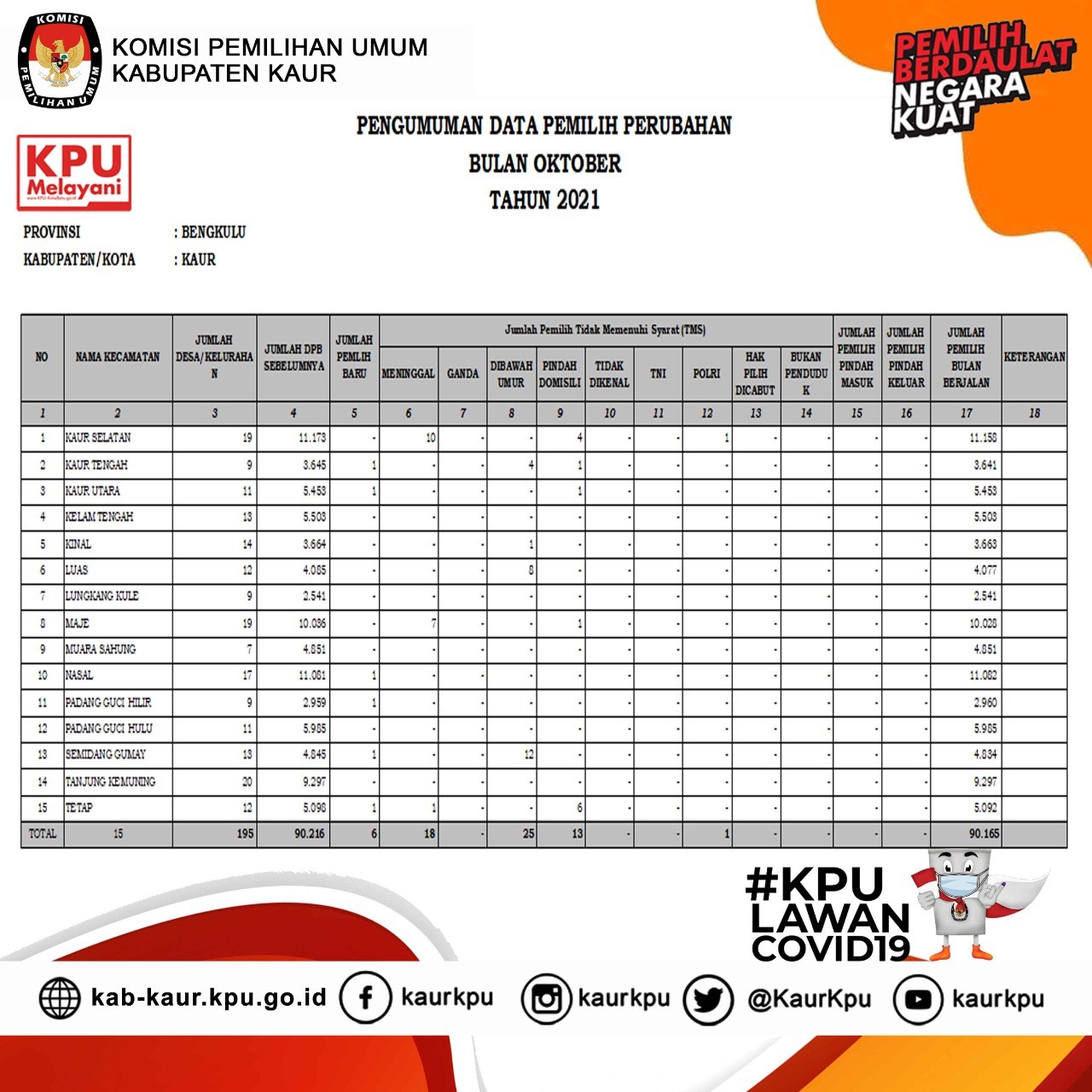 Pada hari ini Jum'at Tanggal Dua Puluh Sembilan Bulan Oktober Tahun Dua Ribu Dua Puluh Satu Bertempat di Sekretariat KPU Kabupaten Kaur, Pukul 10:00 WIB. Komisi Pemilihan Umum Kabupaten Kaur melaksanakan Rapat Pleno yang dihadiri oleh Ketua dan Anggota Komisi Pemilihan Umum Kabupaten Kaur. Rapat Pleno membahas tentang hasil Pemutakhiran daftar Pemilih Berkelanjutan (PDPB) bulan Oktober tahun 2021. Adapun salah satu hasilnya menetapkan Pemutakhiran Daftar Pemilih Berkelanjutan untuk bulan Agustus 2021 berjumlah 90.615 orang yang tersebar di 15 (lima belas) Kecamatan, rekapitulasi dapat dilihat pada gambar dibawah ini :