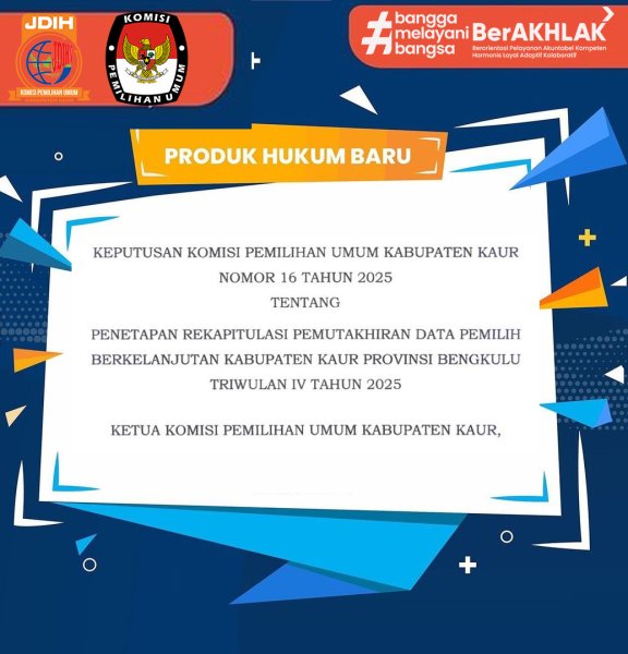 #TemanPemilih, KPU Kabupaten Kaur telah Melaksanakan Rapat Pleno Terbuka Rekapitulasin Pemutakhiran Data Pemilih Berkelanjutan (PDPB) Tingkat Kabupaten Kaur Pada Triwulan Empat bertempat di Media Center KPU Kabupaten Kaur, Senin (8/12/2025) Rapat Pleno ini dipimpin oleh Ketua KPU Kabupaten Kaur Toni Kuswoyo dan di dampingi oleh seluruh Anggota KPU Kabupaten Kaur beserta jajaran. Rapat Pleno ini juga dipandu oleh Anggota KPU Kabupaten Kaur Divisi Perencanaan Data dan Informasi Didi Iswandi yang menjabarkan Hasil dari Penyusunan PDPB pada Triwulan Empat. Kegiatan ini merupakan bagian dari komitmen KPU dalam memperbarui data pemilih secara berkala dan memudahkan proses penyusunan daftar pemilih pada Pemilu atau Pemilihan berikutnya secara akurat. Rapat pleno ini juga dihadiri oleh , Bawaslu Kaur, Dinas PMD Kaur, Disdukcapil Kaur, Kodim 0408 BS/Kaur, Polres Kaur, Kejaksaan Negri Kaur, Partai Politik Peserta Pemilu 2024. Berdasarkan Keputusan KPU Kabupaten Kaur Nomor 16 Tahun 2025 menetapkan bahwa Rekapitulasi Pemutakhiran Data Pemilih Berkelanjutan (PDPB) Triwulan Empat Tahun 2025 “Jumlah pemilih hasil pemutakhiran terdiri dari 50.947 (Lima puluh koma sembilan empat tujuh) pemilih laki-laki dan 48.777 (Empat puluh delapan koma tujuh tujuh tujuh) pemilih perempuan, sehingga total keseluruhan adalah 99.724 (Sembilan puluh sembilan ribu tujuh ratus dua puluh empat) pemilih.” dapat di download pada link Keputusan KPU Kabupaten Kaur Nomor 16 Tahun 2025 #KPUMelayani ....