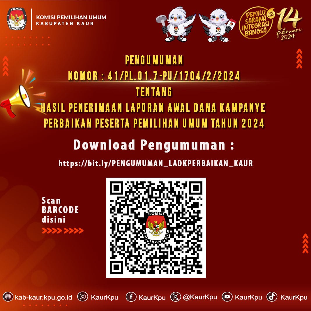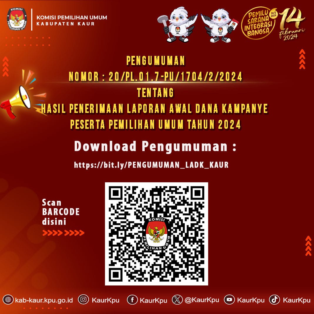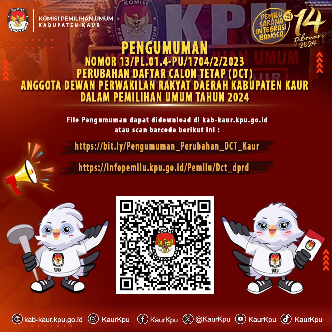 Pengumuman dapat diunduh melalui link https://bit.ly/Pengumuman_Perubahan_DCT_Kaur , https://infopemilu.kpu.go.id/Pemilu/Dct_dprd dan Scan Barcode atau dapat langsung kunjungi Kantor KPU Kabupaten Kaur.
