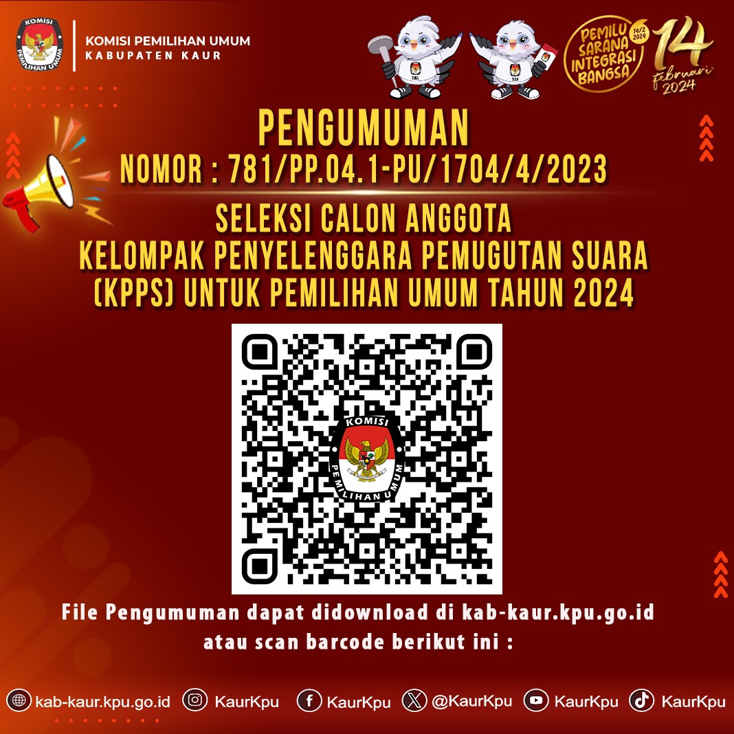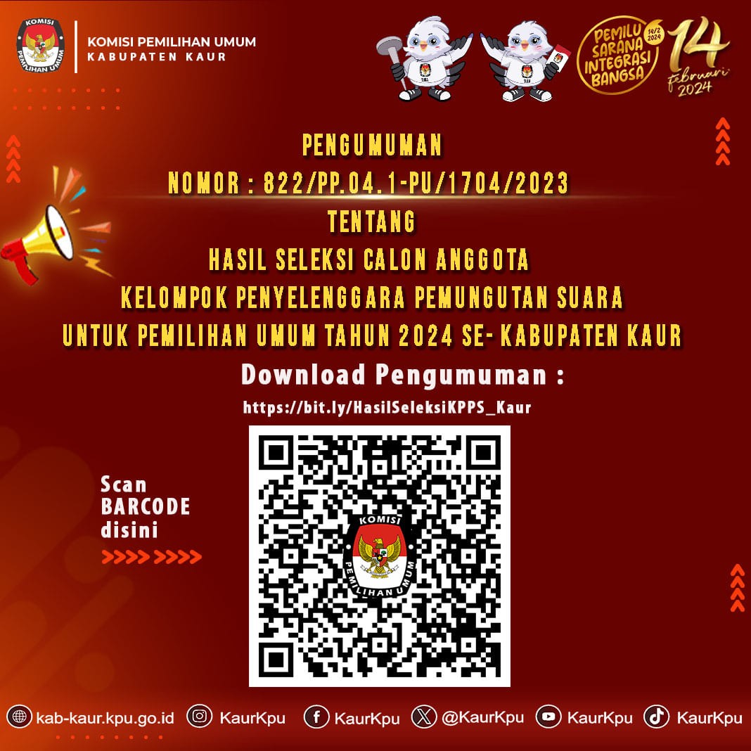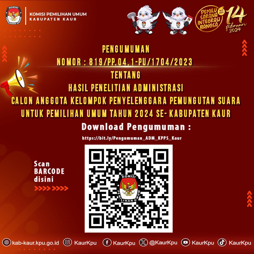 Pengumuman dapat diunduh melalui link https://bit.ly/Pengumuman_Perubahan_DCT_Kaur , https://infopemilu.kpu.go.id/Pemilu/Dct_dprd dan Scan Barcode atau dapat langsung kunjungi Kantor KPU Kabupaten Kaur.
