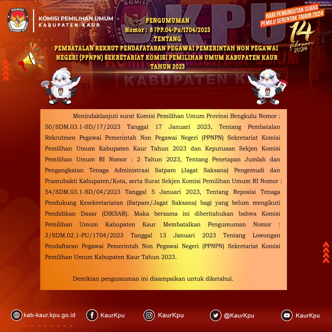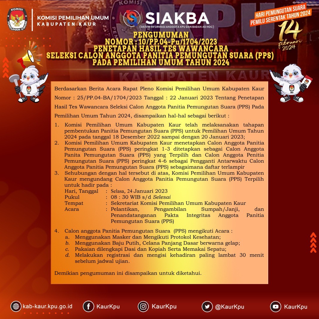 #Temanpemilih Berdasarkan Berita Acara Rapat Pleno Komisi Pemilihan Umum Kabupaten Kaur Nomor : 25/PP.04-BA/1704/2023 Tanggal : 22 Januari 2023 Tentang Penetapan Hasil Tes Wawancara Seleksi Calon Anggota Panitia Pemungutan Suara (PPS) Pada Pemilihan Umum Tahun 2024, disampaikan hal-hal sebagai berikut :