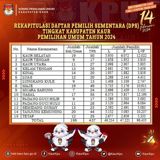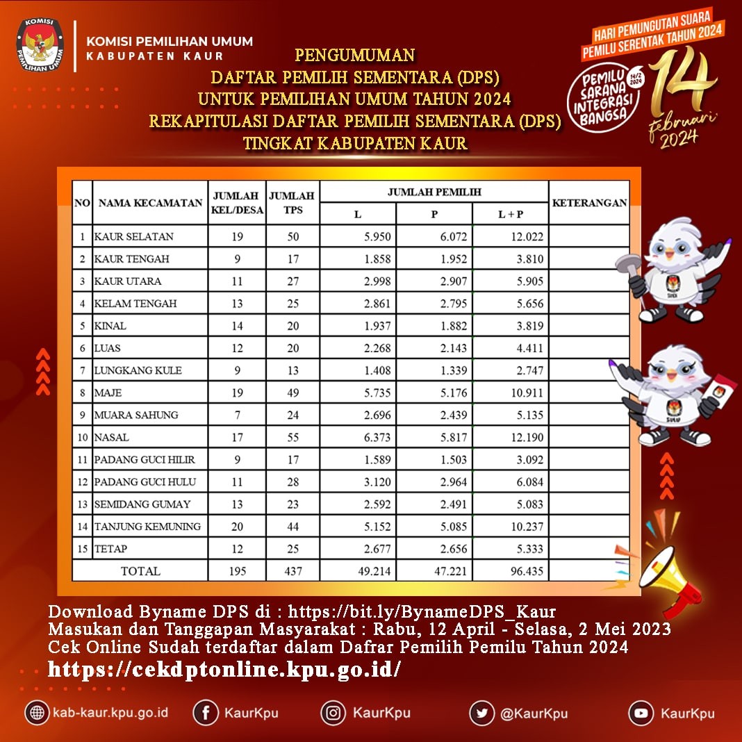 Komisi Pemilihan Umum Kabupaten Kaur telah melaksanakan tahapan pembentukan Panitia Pemungutan Suara (PPS) untuk Pemilihan Umum Tahun 2024 pada tanggal 18 Desember 2022 sampai dengan 20 Januari 2023;