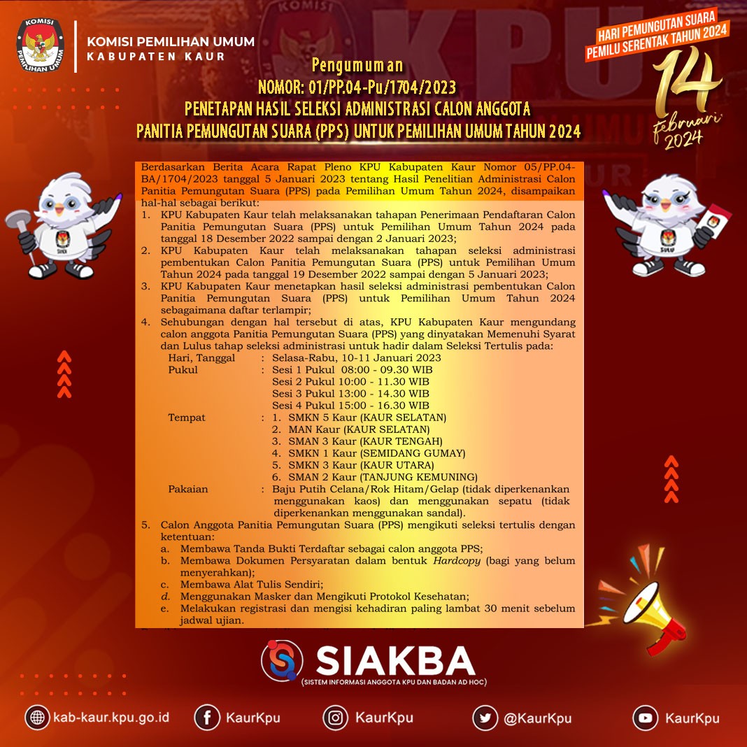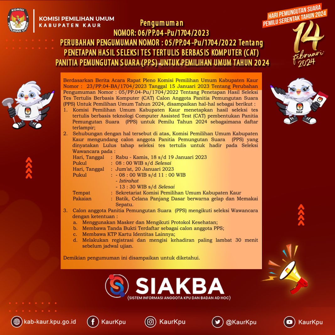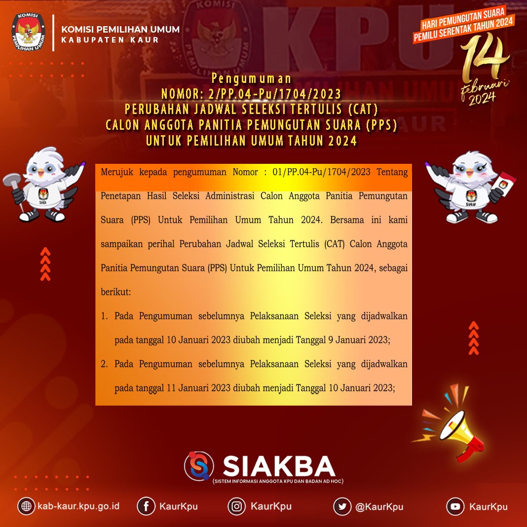 #TemanPemilih, KPU Kabupaten Kaur mengumumkan Perubahan Jadwal Seleksi Tertulis (CAT) Calon Anggota Panitia Pemungutan Suara (PPS) Untuk Pemilihan Umum Tahun 2024, sebagai berikut: