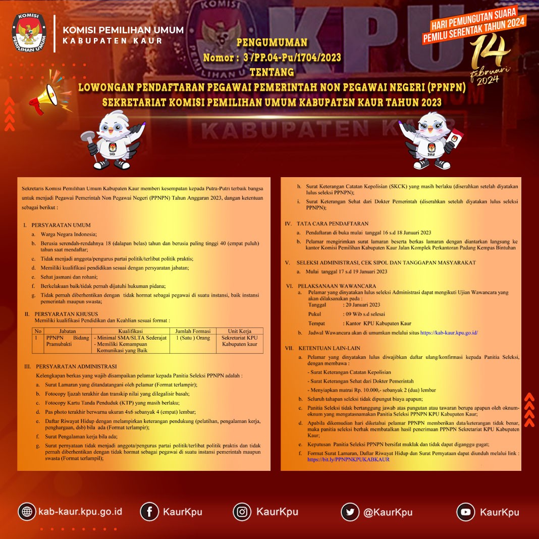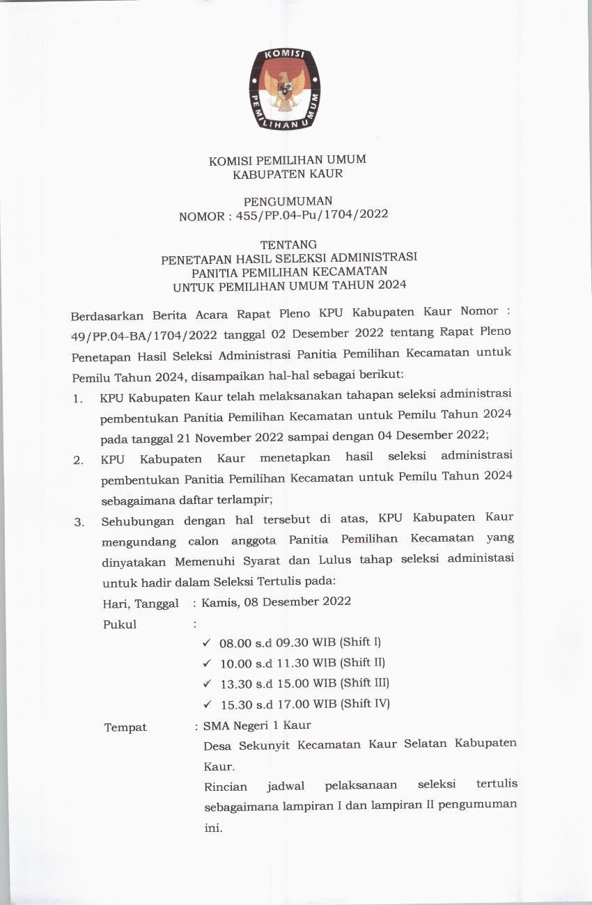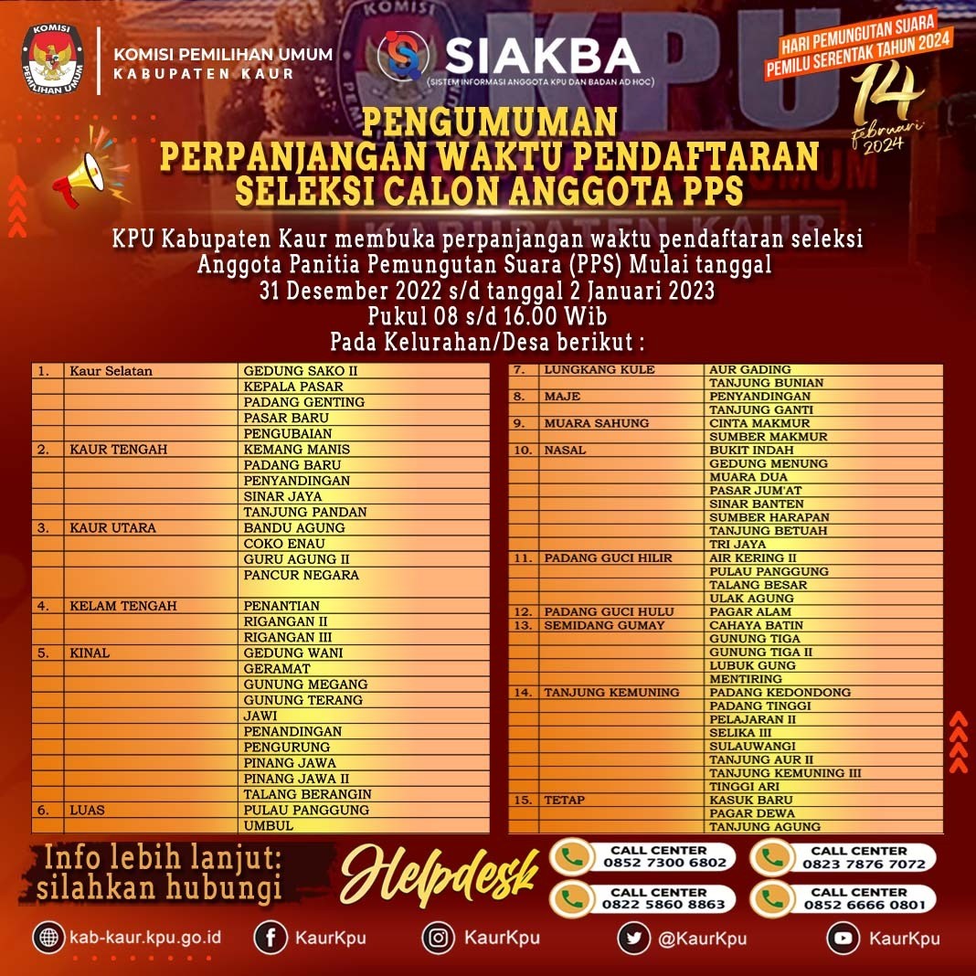 #TemanPemilih, KPU Kabupaten Kaur mengumumkan Perubahan Jadwal Seleksi Tertulis (CAT) Calon Anggota Panitia Pemungutan Suara (PPS) Untuk Pemilihan Umum Tahun 2024, sebagai berikut: